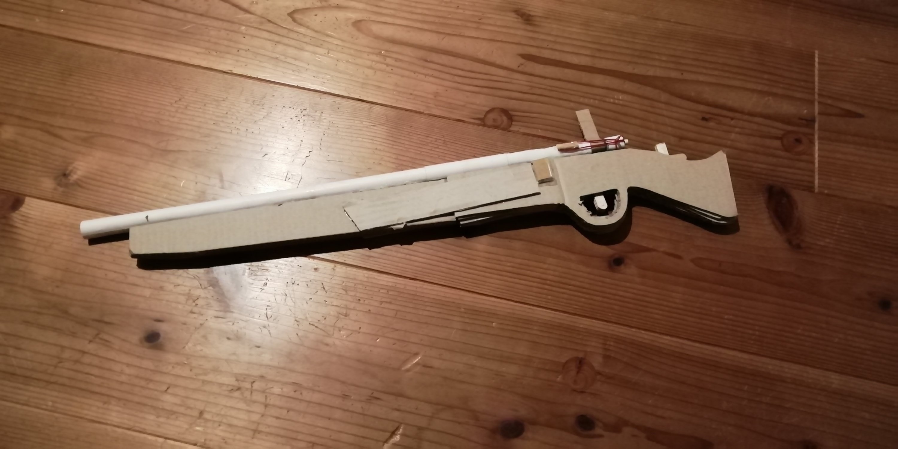 お手本はYouTubeに載っていたKa98のダンボールライフルだったけれど、装填機構が小学生には難しそうだったのでそれは廃止して、1発づつ手で装填するようにした。