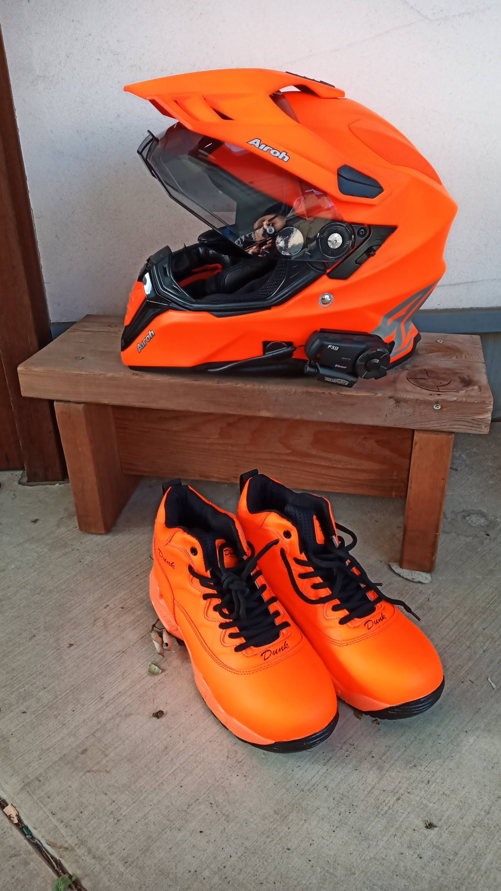 ド派手な蛍光オレンジで、Airohのヘルメットと色がバッチリ合っている(笑)