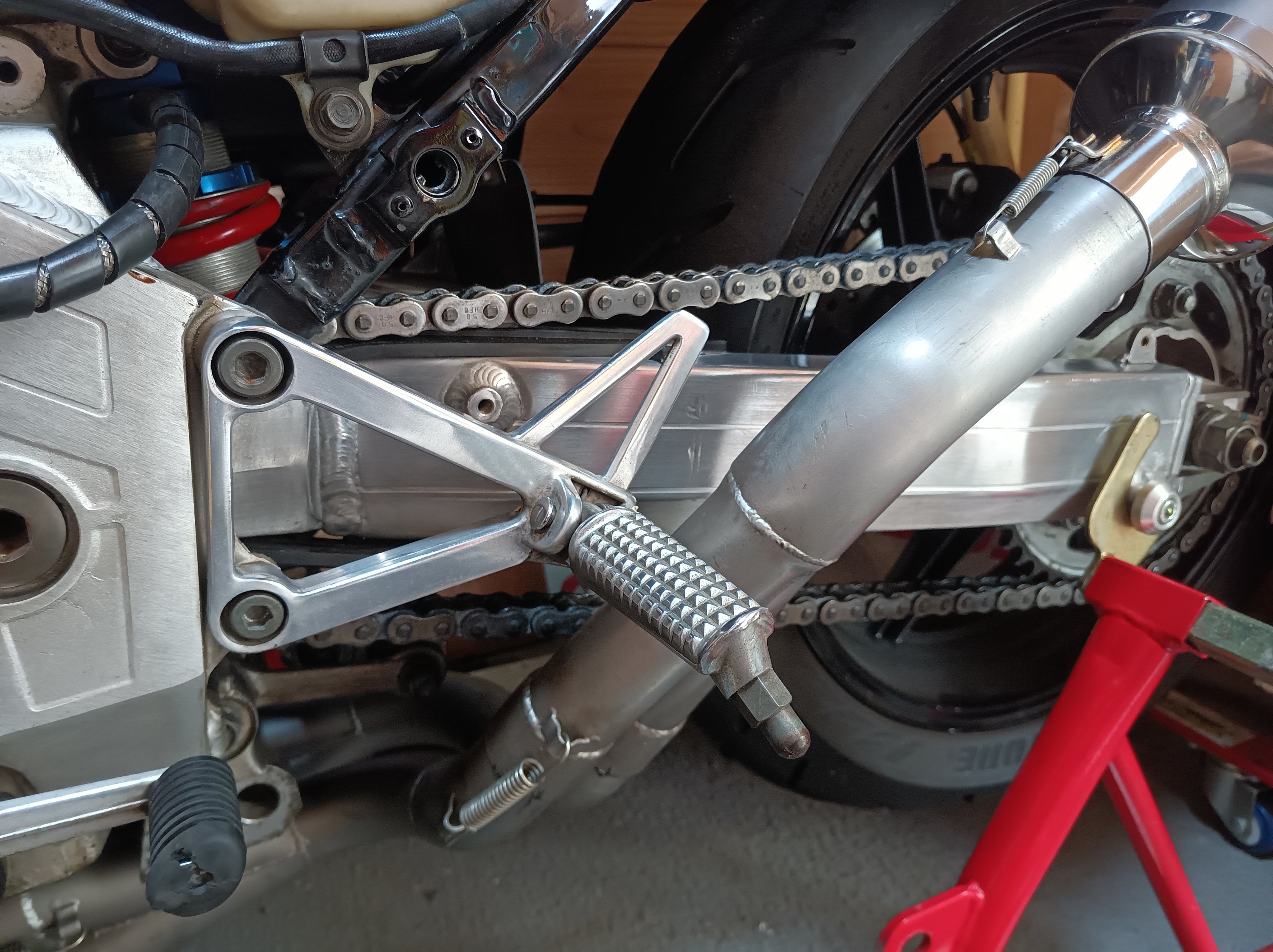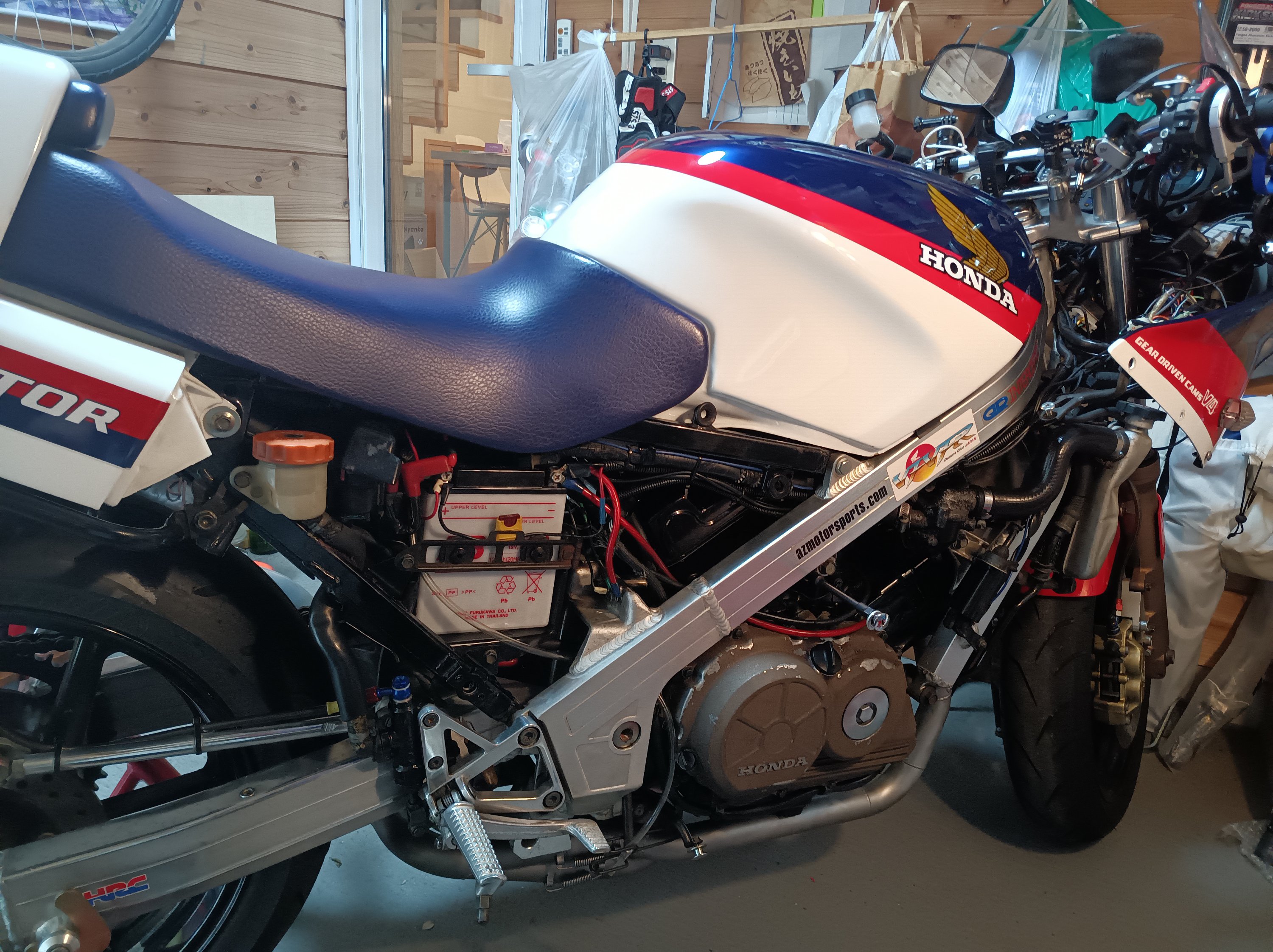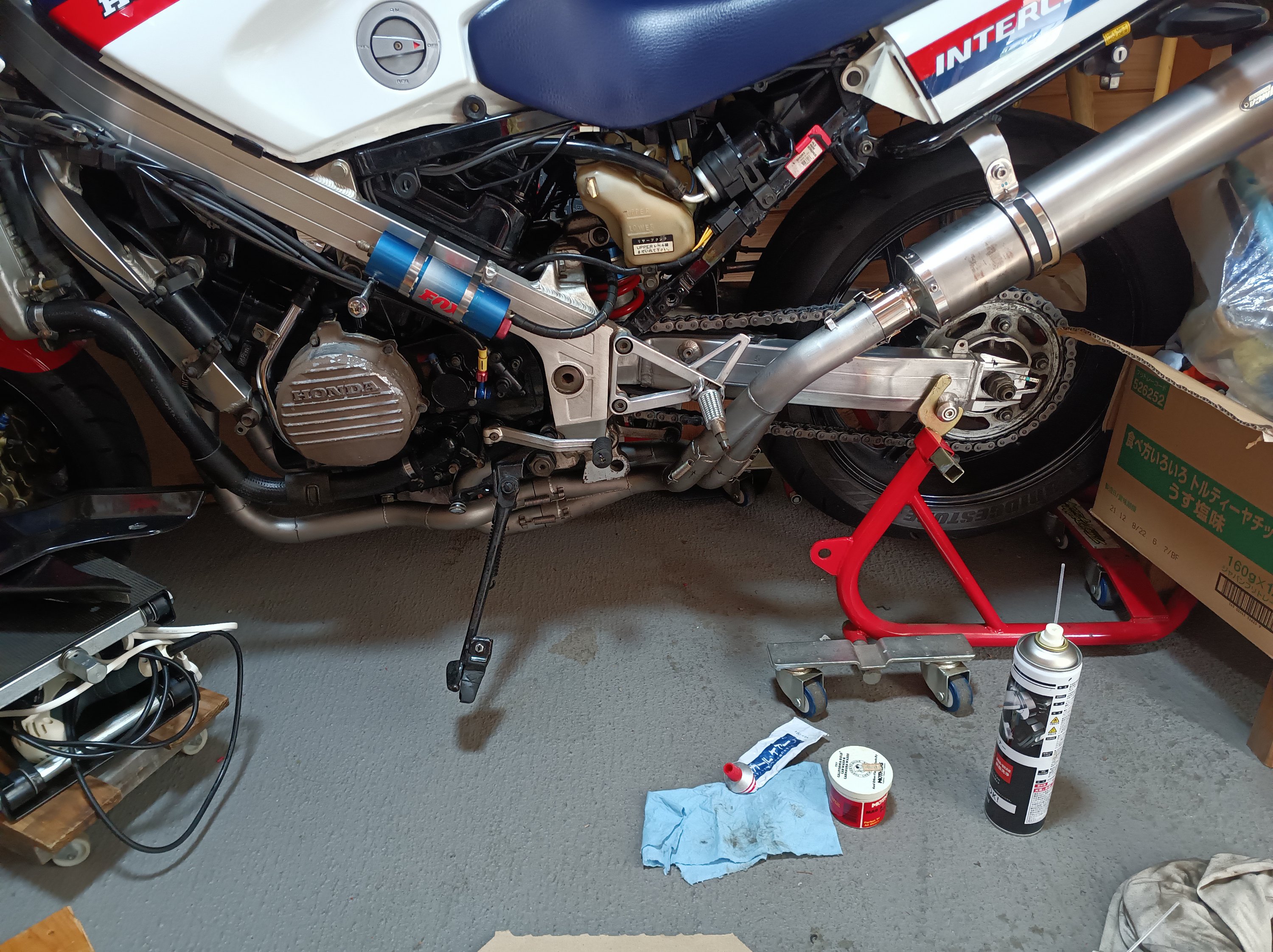暑いな…毎日暑いわ。今日はまだマシだったので、カウルを外したままのRC24(VFR750F)を掃除した。普段はカウルで隠れてる部分のアルミフレームとステップまわりをピカールケアー(チューブ入のピカール)とMother’sで磨き、黒塗装とゴム・プラスチック部分はシリコンスプレーをウエスにとって磨いてやった。