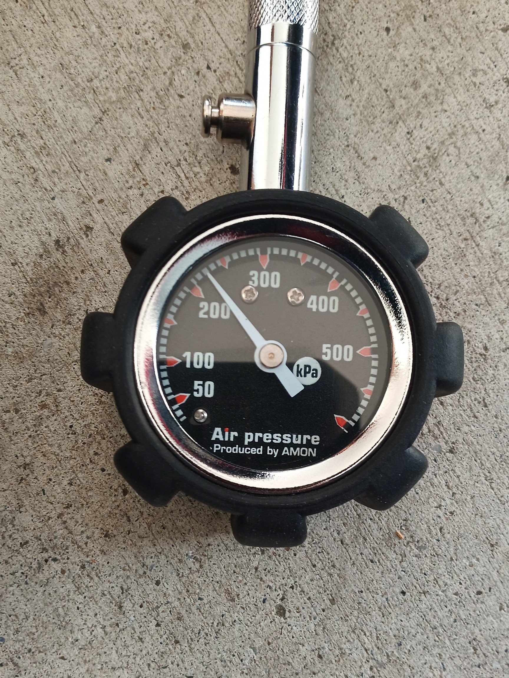 この写真はフロントタイヤの空気圧で、左が土曜日に220kpaにした直後、右は月曜日に測った空気圧で160kpaだ。