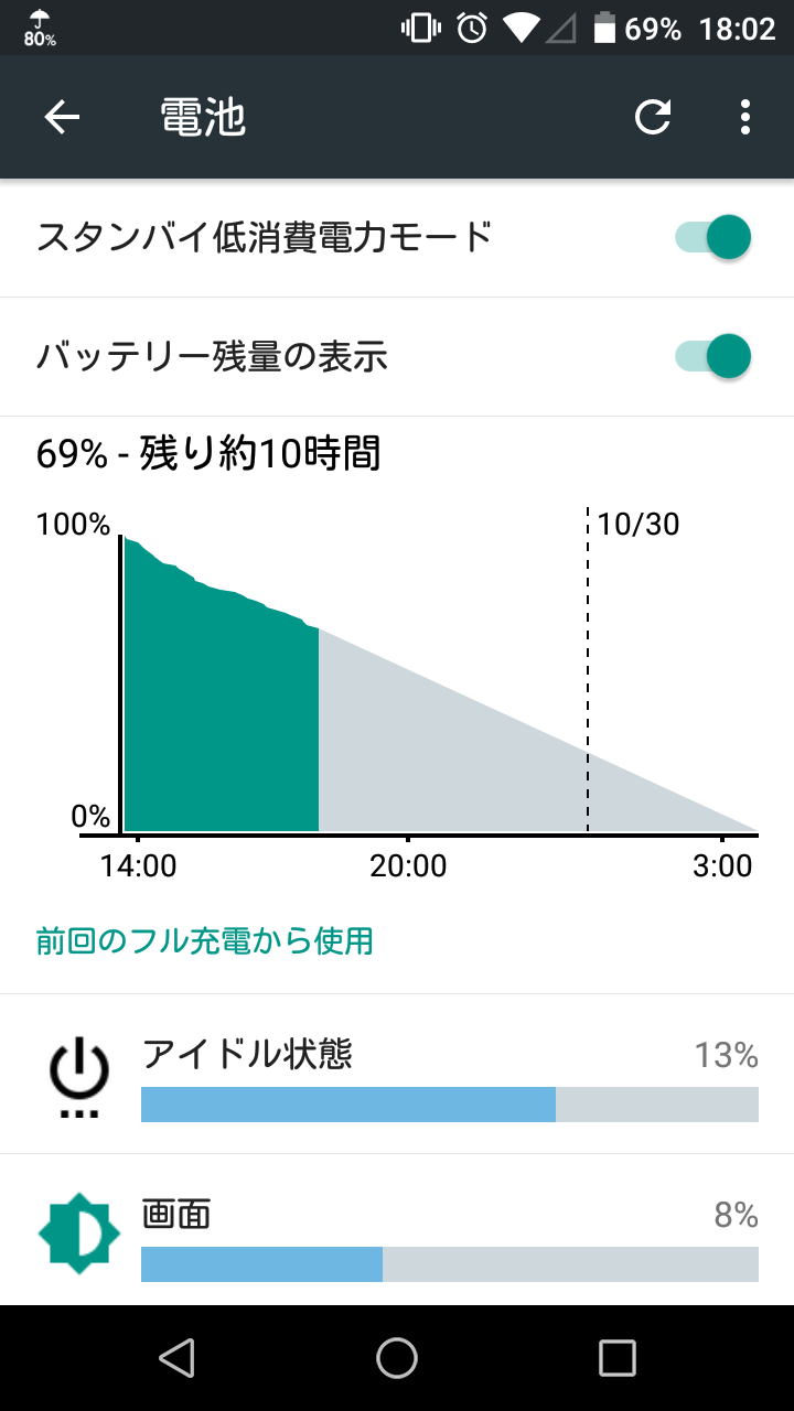 2017/10/29 追記 14時くらいに満充電してから約4時間で30%ほど消費…。どう評価したものか…。