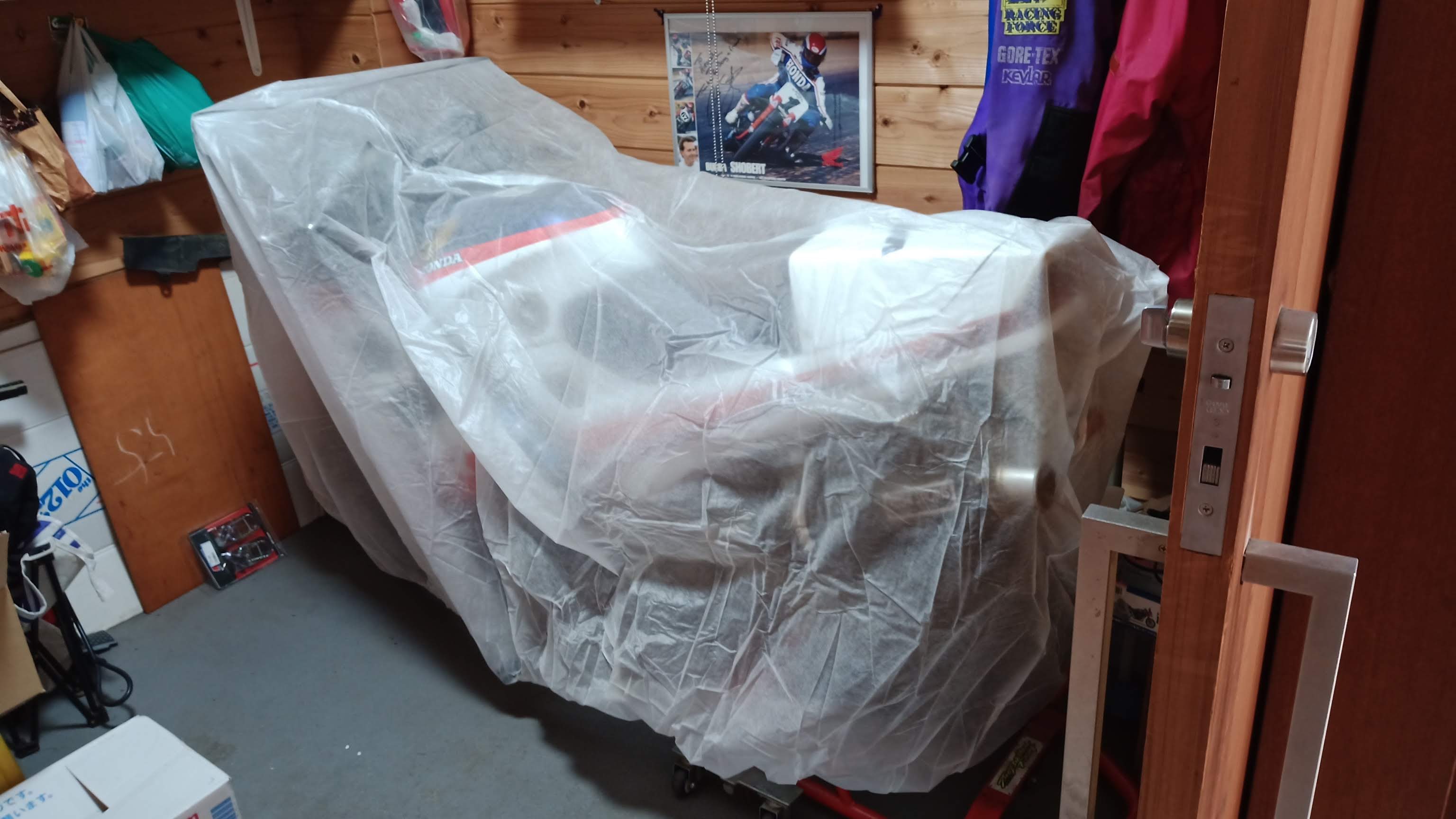 ウチはバイクを屋内保管しているが、CRFはほぼ毎日乗っているものの、RC24は月に一度乗るかどうかって感じなので、屋内ガレージとは言え若干ホコリがついてしまう。