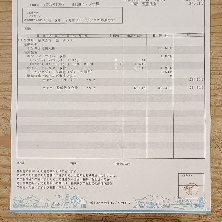 2023年1月11日2023年1月11日v4hero 86の1年点検 備忘録。 86の1年点検を受けて来た。買ったときに車検切れで、車検を受けてから納車されたからね。 点検メニューに、オイルとオイルフィルターの交換を追加してもらった。26,515円。
