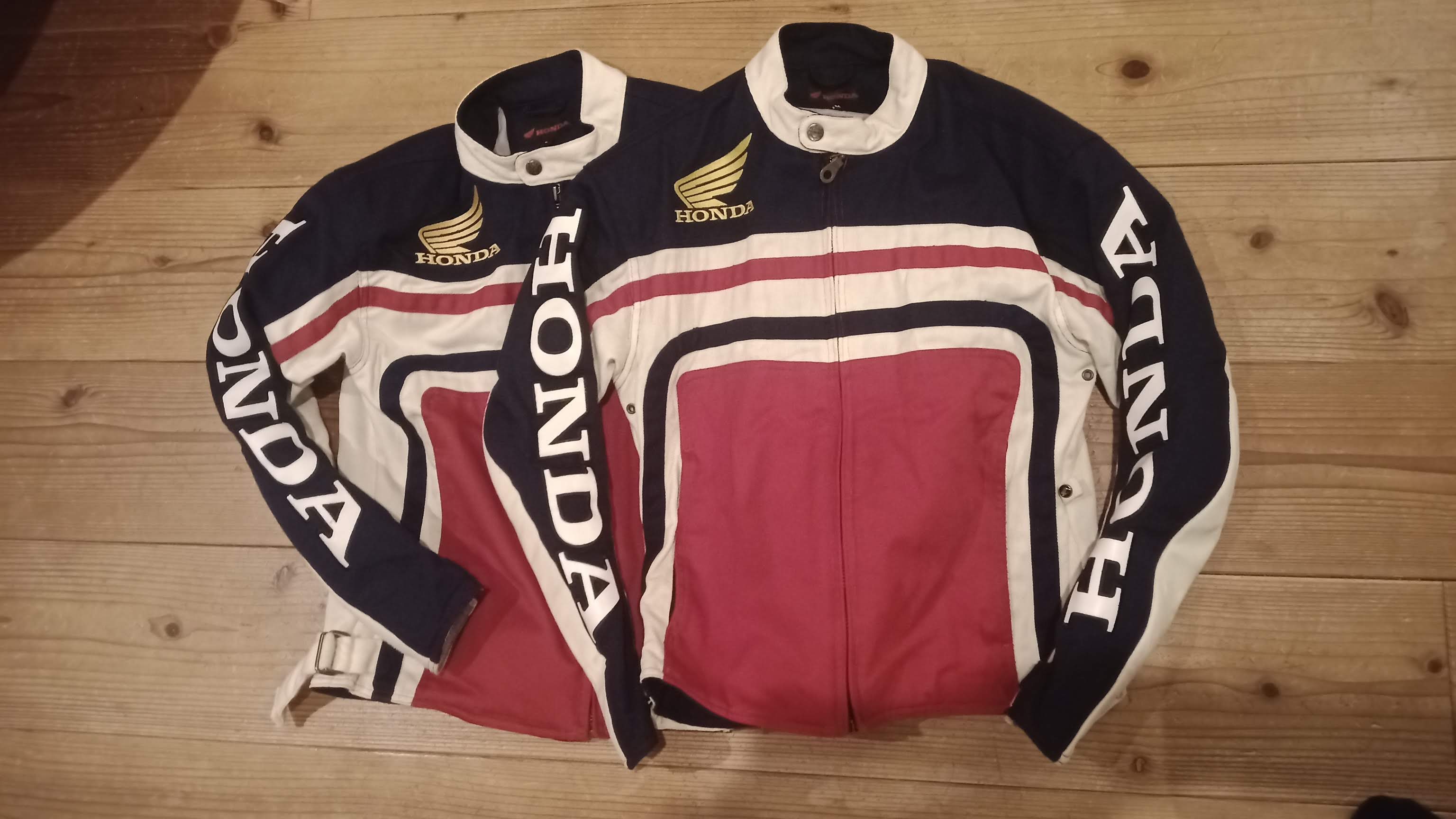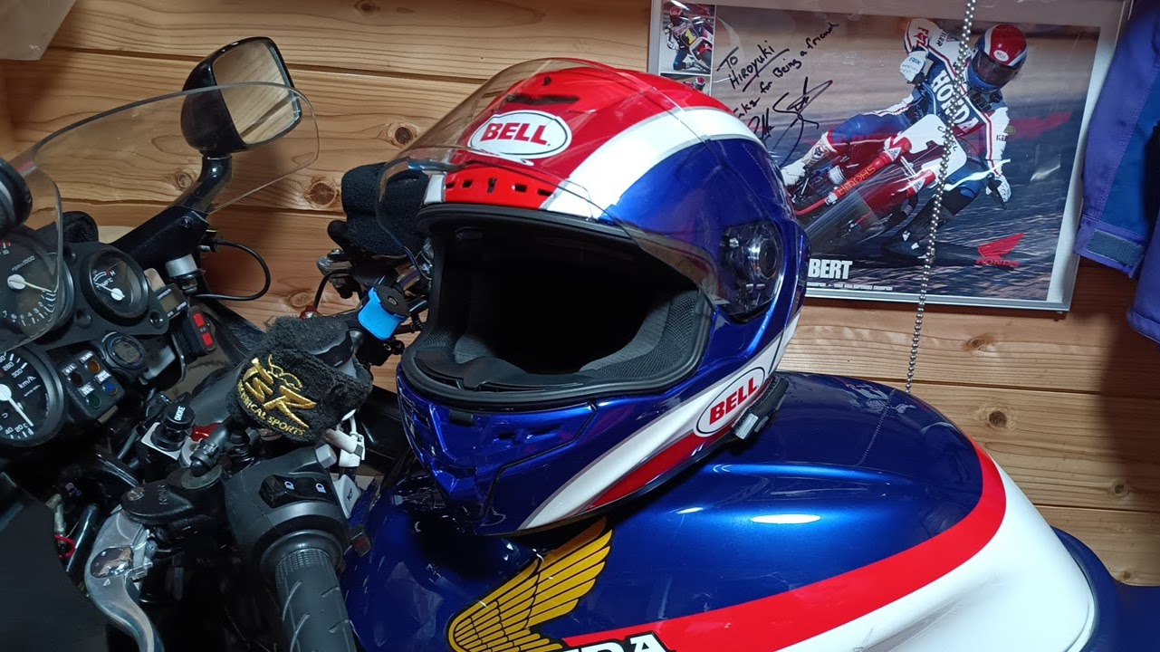 ヘルメットはBell Star Classic Red/Blackを車用のラッピングフィルムでトリコロールにしたもの。ジャケットはちょっと古めのHONDA純正のトリコロールだ。