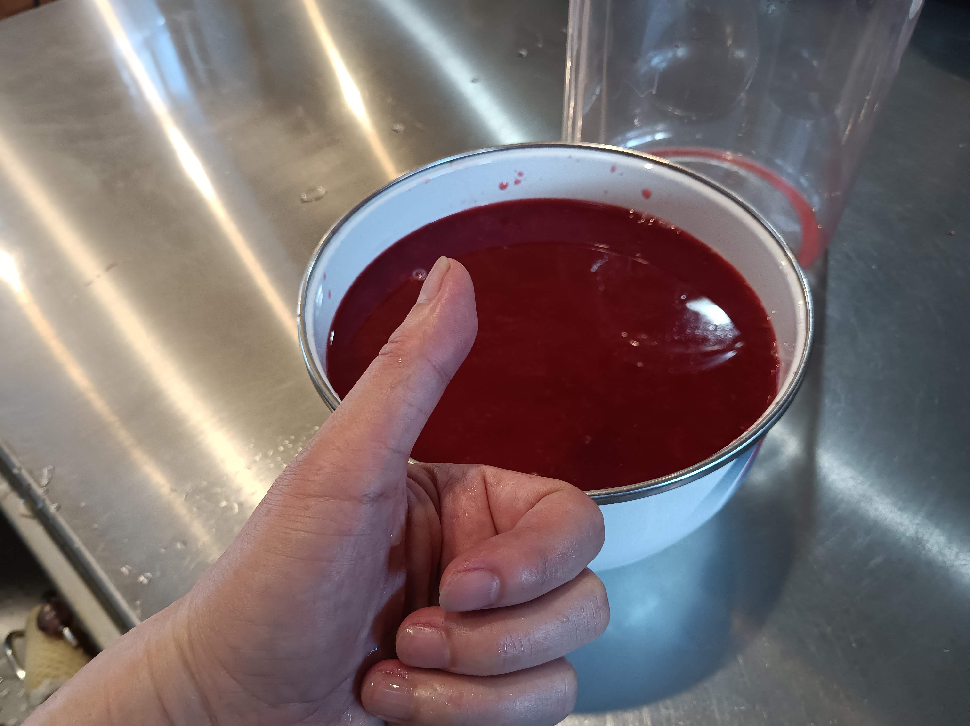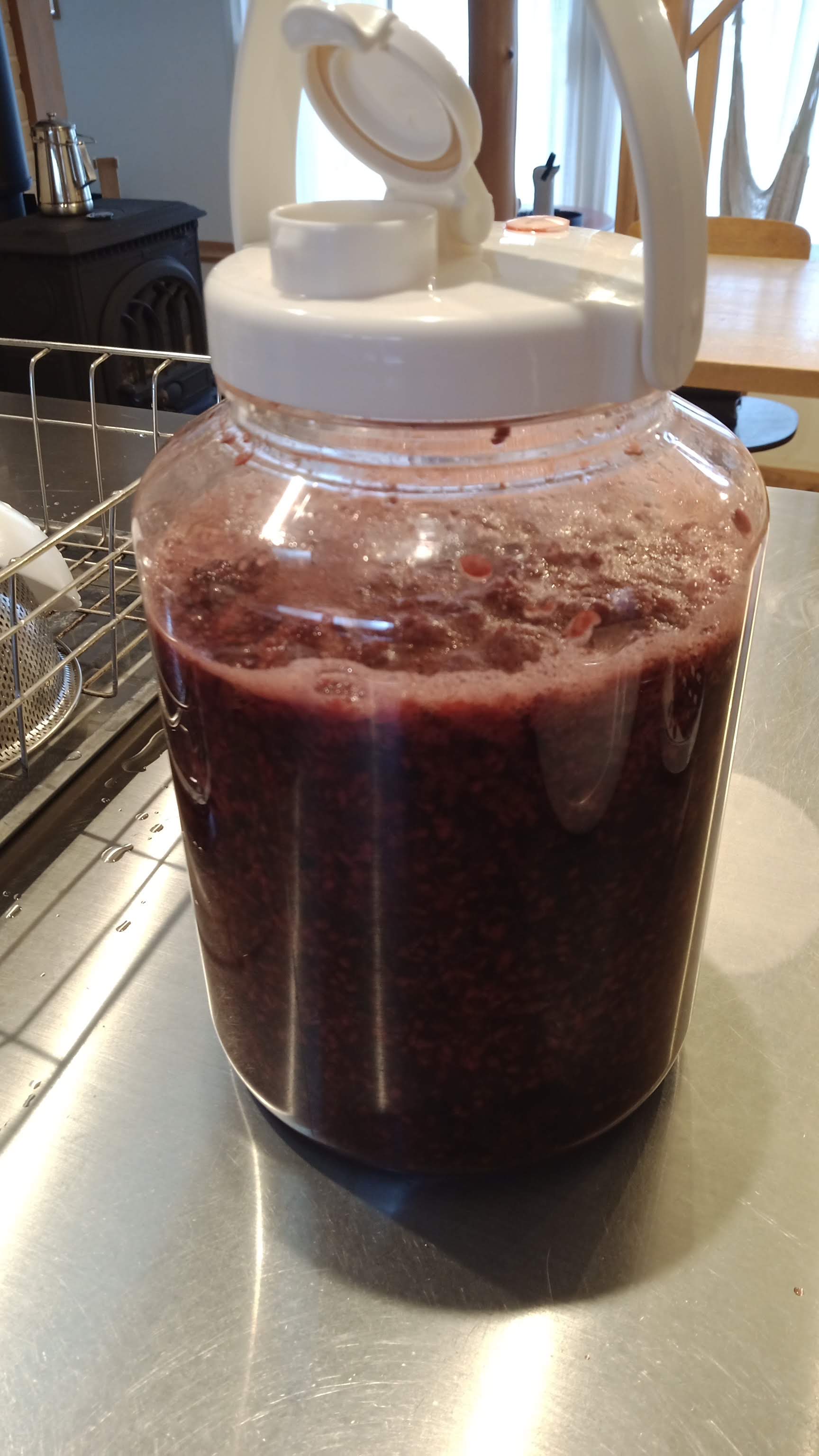 庭で獲れるブラックベリーだが、大量に獲れるので去年からワインを作っている。と言ってもアルコール度数が1%を超えてしまうと違法になるので、発酵は2日だけだ。飲んでもほとんどアルコールを感じないが、炭酸ガスが入っていてシュワーって感じの爽やかな飲み口になる。