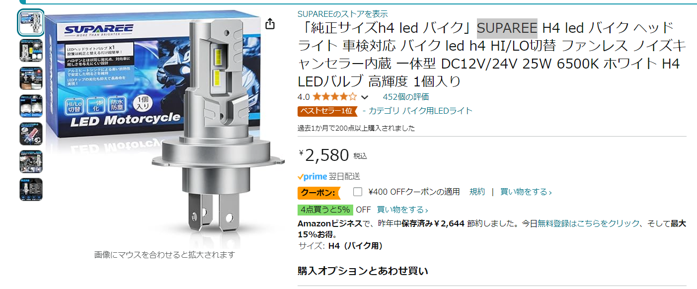 ってことで、今度はAmazonでSUPAREEてブランドのバイク用と書いてあるのに換えてみた。SPHERELIGHTみたいな名前だけど違う。中国製だ。