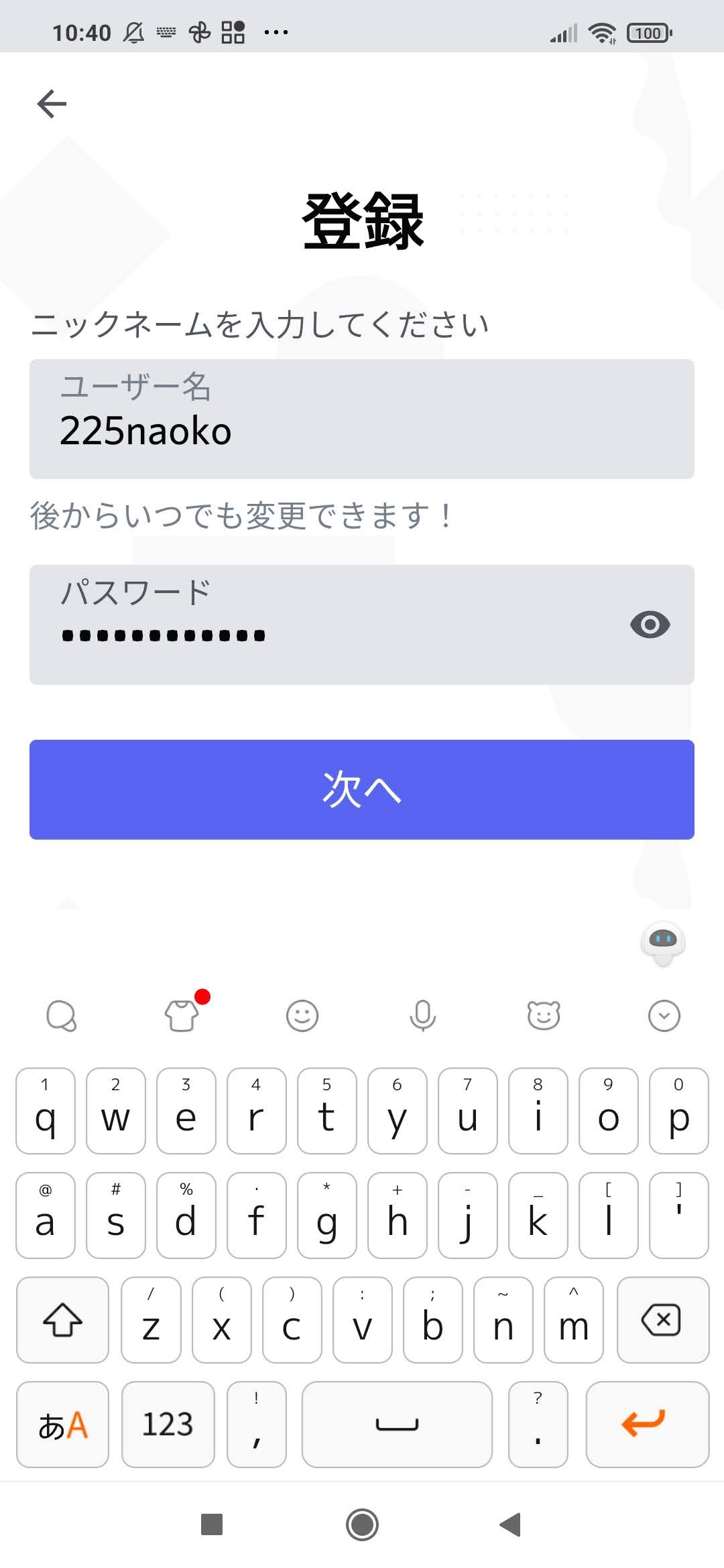 入力した電話番号あてにSMSで認証コードが来るので、認証コードを入力する。すると次の画面が表示されるので、アカウント名とパスワードを決めて入力する。ここで入力するアカウント名はdiscord利用者全員から見えるのでインスタと同様にテキトウな名前(櫻井の場合はv4hero。この例では妻の名前を借りたので225naoko)を入れておくことをお勧めします。