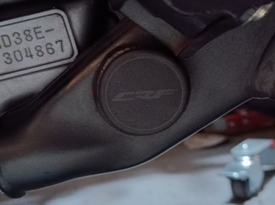 スイングアームピボットとエンジンのロアマウントのボルトの穴をふさぐ飾り蓋だ。俺のCRFはフレームガードを付けているのでスイングアームピボットの穴はそれで塞がっているから、使ったのはエンジンマウント穴の蓋だけだ。