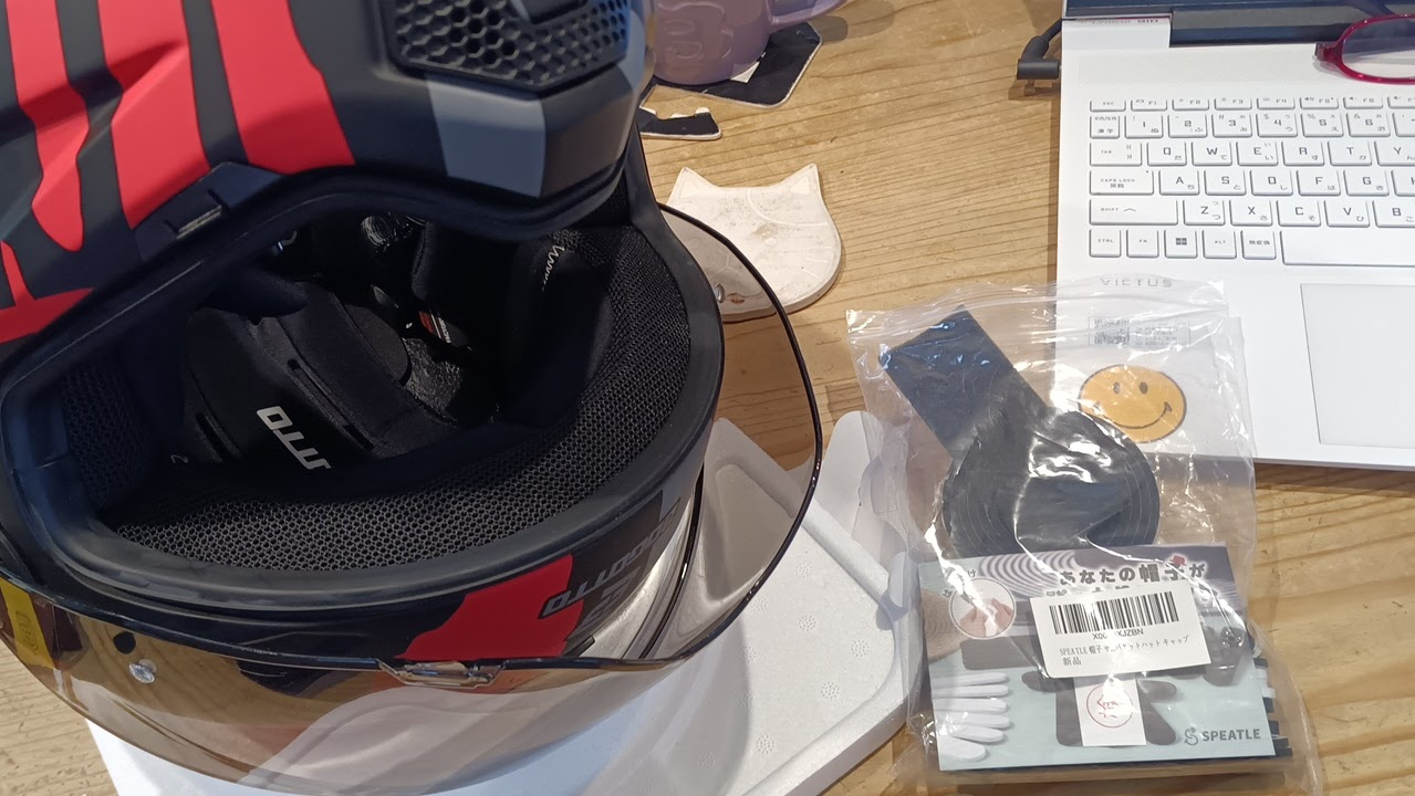 あと、頭の形が変なので、ヘルメットを被るとまっすぐ前を向いていてもヘルメットは若干右向きになっちゃうんだよね。なので、Amazonで帽子用の隙間テープキットを買って補正してやった。