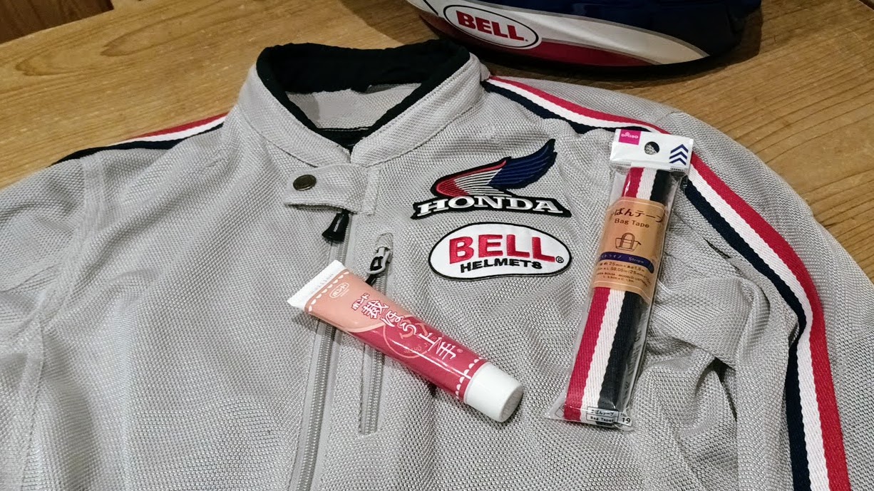 コレにAmazonで買ったHONDAとBELLのワッペンを貼り付けて、肩のストライプはダイソーのかばんテープをコニシの「裁ほう上手」と言う布用の接着剤で貼り付けてある。