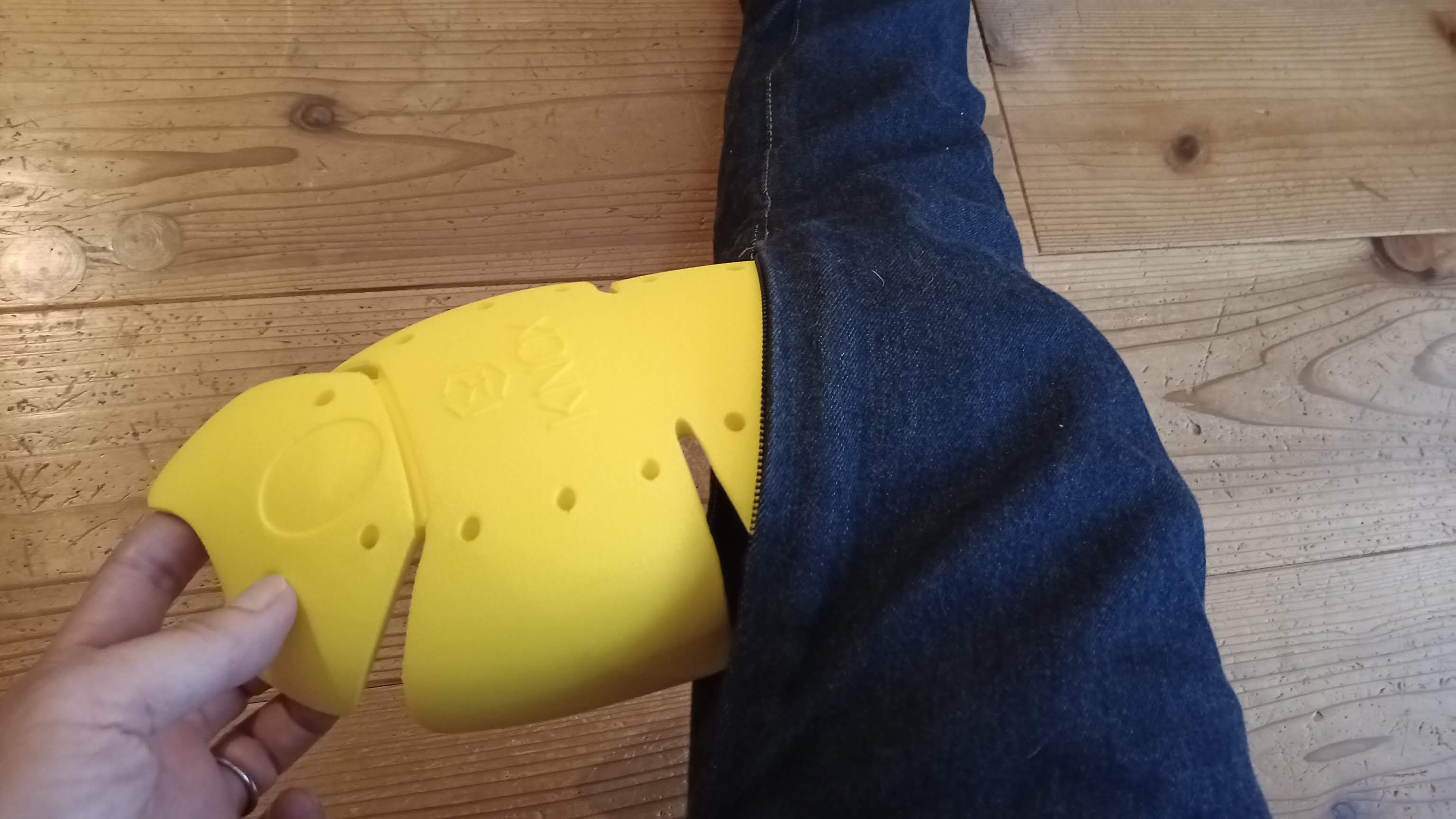プロテクターは膝と腰に入ります。膝は外から、腰は中から入れます。