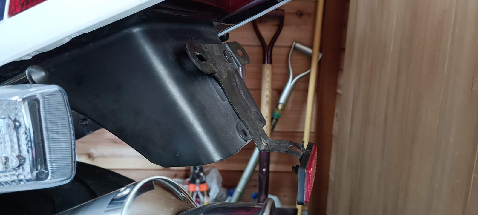 ナンバーを斜めにすることが似合うほどの小僧でもないので、リアフェンダーに平行になるようなナンバープレートホルダーとCRFでも使っているリフレクターに変更した。