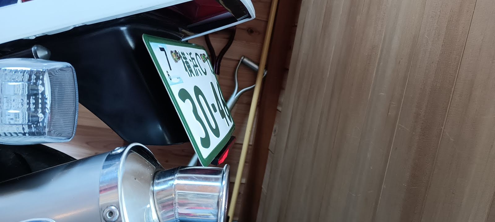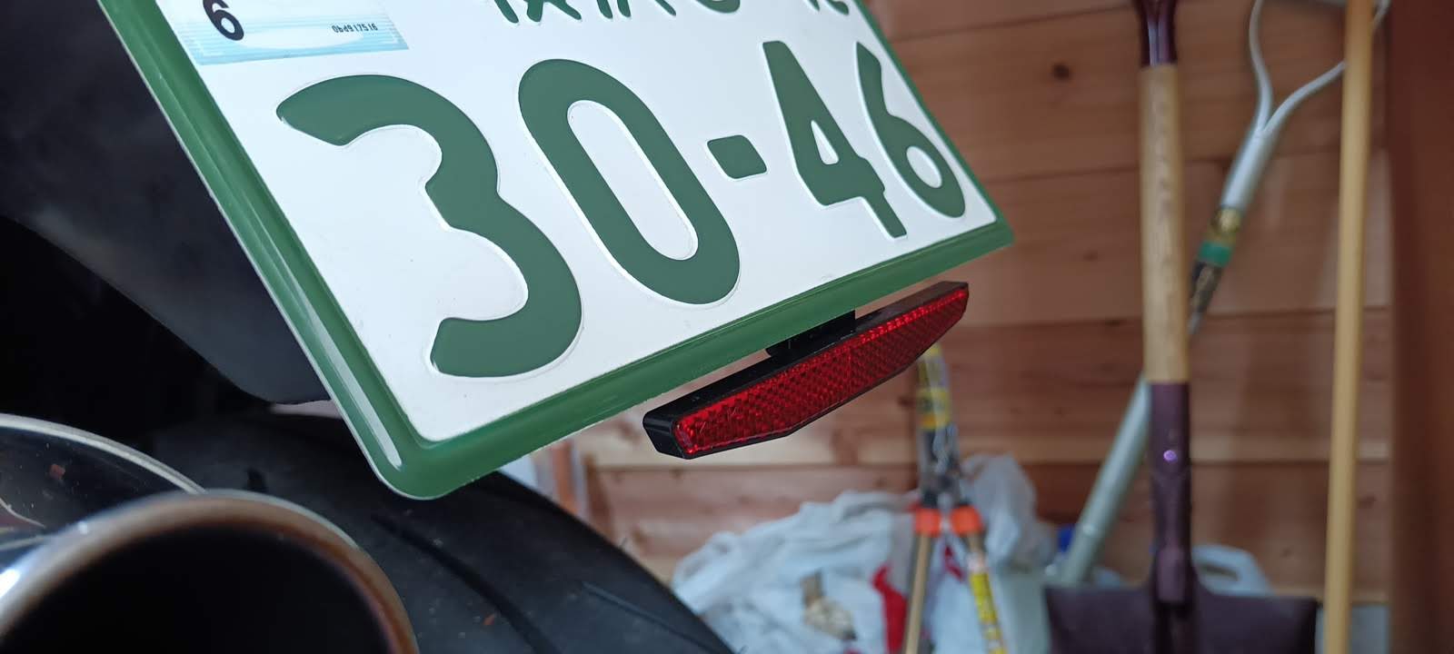 ちなみに、ちょっとした工夫だけど、ナンバープレートの真ん中。この写真で言うと0と4の間の「ー(ハイフン)」の裏あたりを両面テープでリフレクターの板に貼り付けてある。