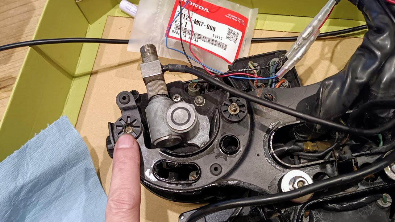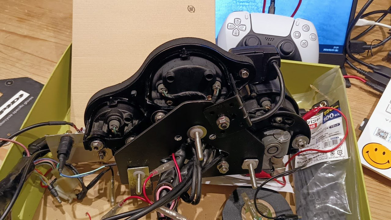 ステーが出来たところで一旦仮マウントしてカプラーを繋いでみたが、スピードメーターの照明が点灯しなかった。取り外して調べてみたら、RC24のカプラ側とNC30のメーター側を繋いであった結線コネクタが抜けてしまっていた。