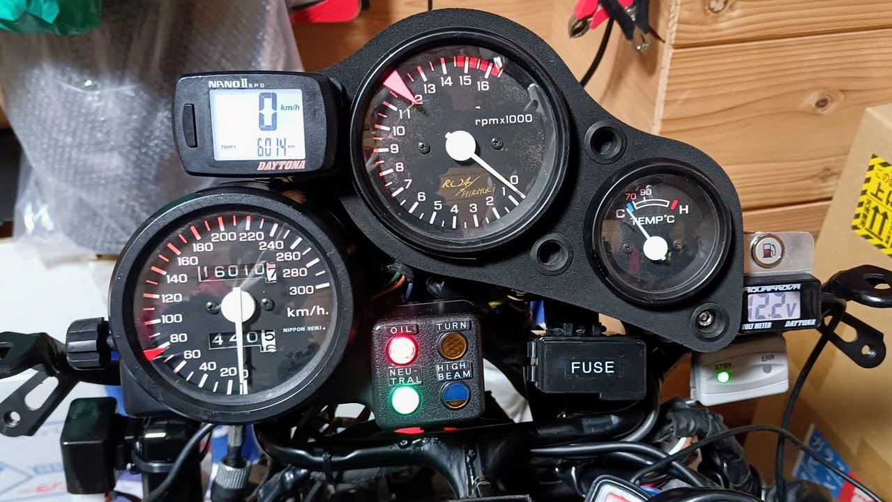 俺のRC24(VFR750F)にはNC30(VFR400R)のメーターが付いていて、最初はタイラップ固定で、その後簡易的にアルミ板でマウントをつくってやって固定していた。