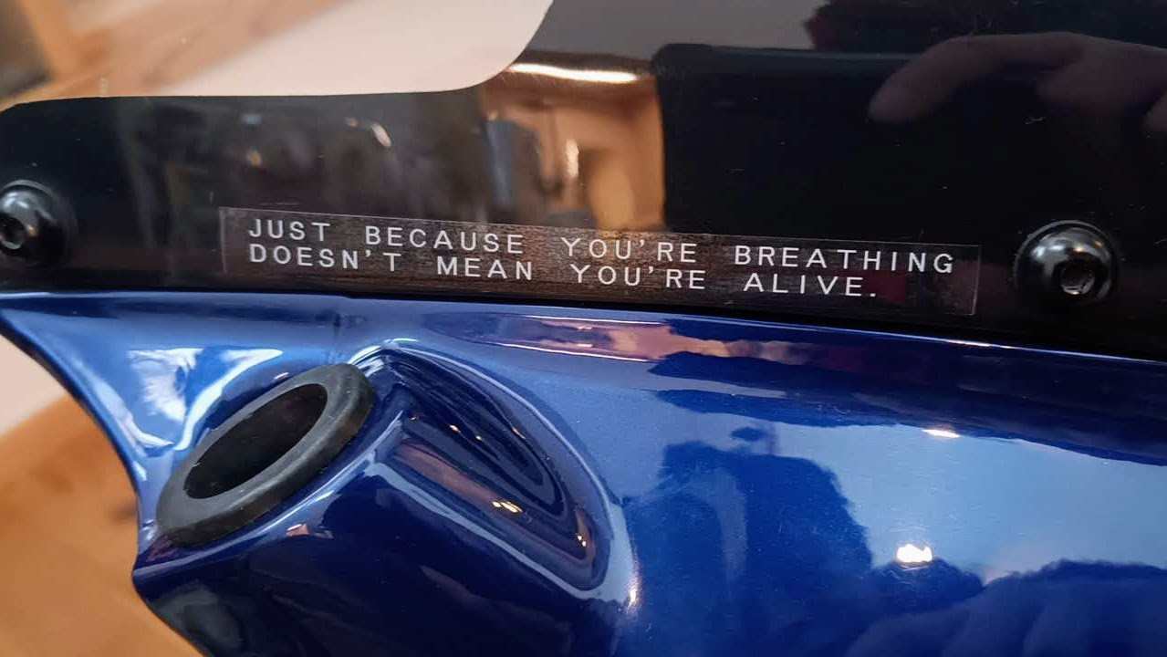 けっこう面白いので、カウルやヘルメットにこのブログの副題「JUST BECAUSE YOU’RE BREATHING DOESN’T MEAN YOU’RE ALIVE.」を入れてやった。