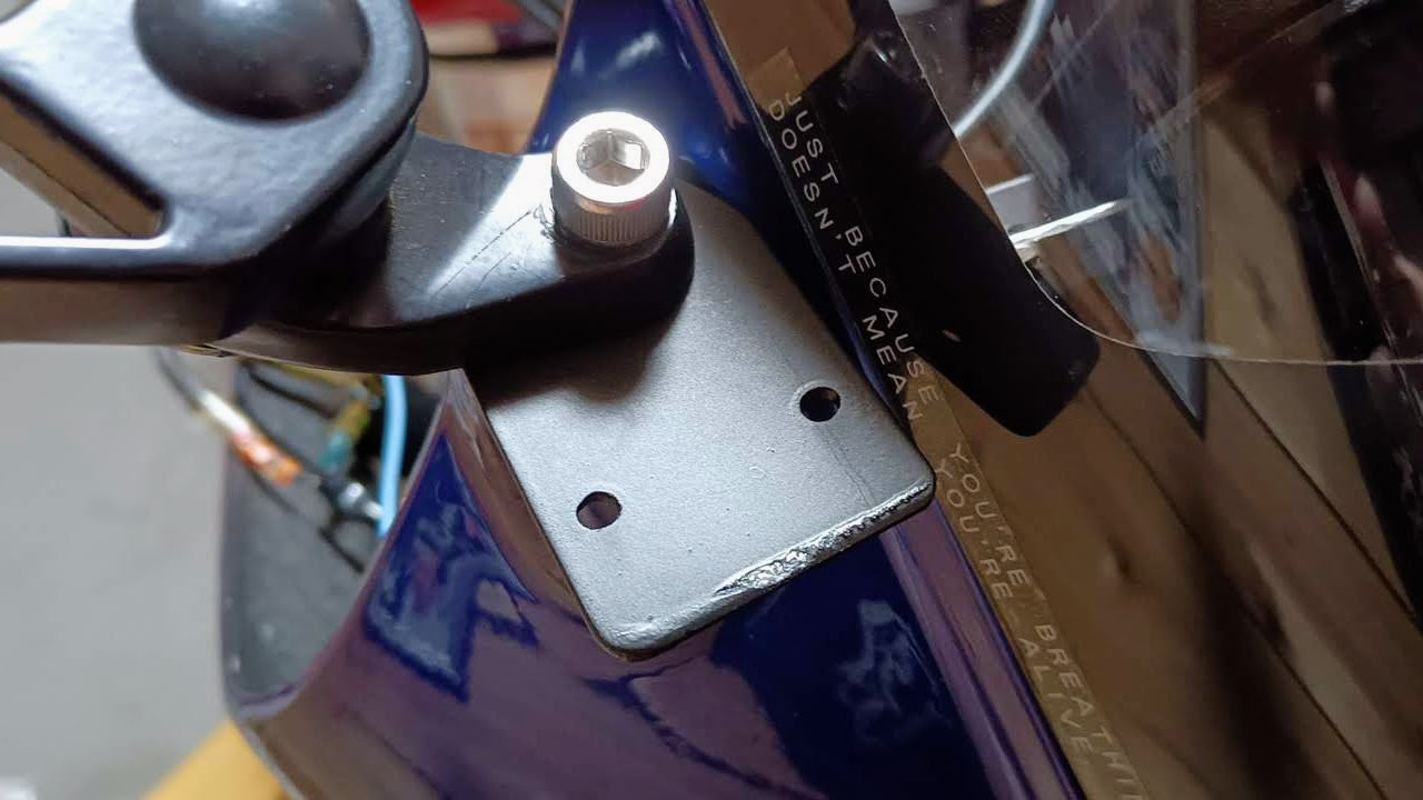 ドラレコカメラも以前はミラーのアーム部分に両面テープで固定していたが、それだとカウルを外した時にミラーが宙吊りになっていたので、今回はステーを2mmのアルミ板を切って塗装したものを用意した。いい感じに出来たよ。