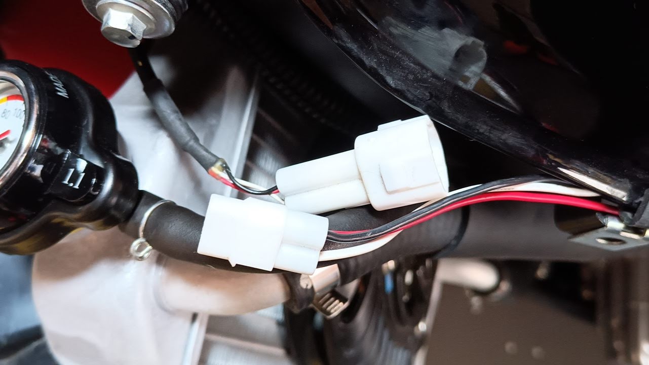 防水コネクタとは言え、見える場所にあるのはカッコ悪い。かと言って配線の長さの都合で前後に移すこともできないのと、もうメーター横で固定だろうから、このコネクタを切り飛ばして配線を繋いでしまうことにした。