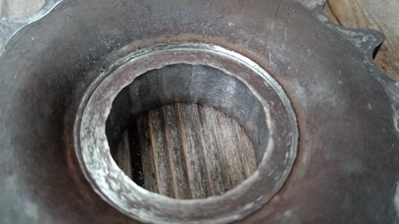 QRでカスタムしてくれた当初は(多分、チェイスモーターサイクルの)CB750F用のオフセットスプロケットでオフセットしてあったが、2002年の7月くらいにスプロケット側のスプラインが砕けて首都高で擱座してしまった。