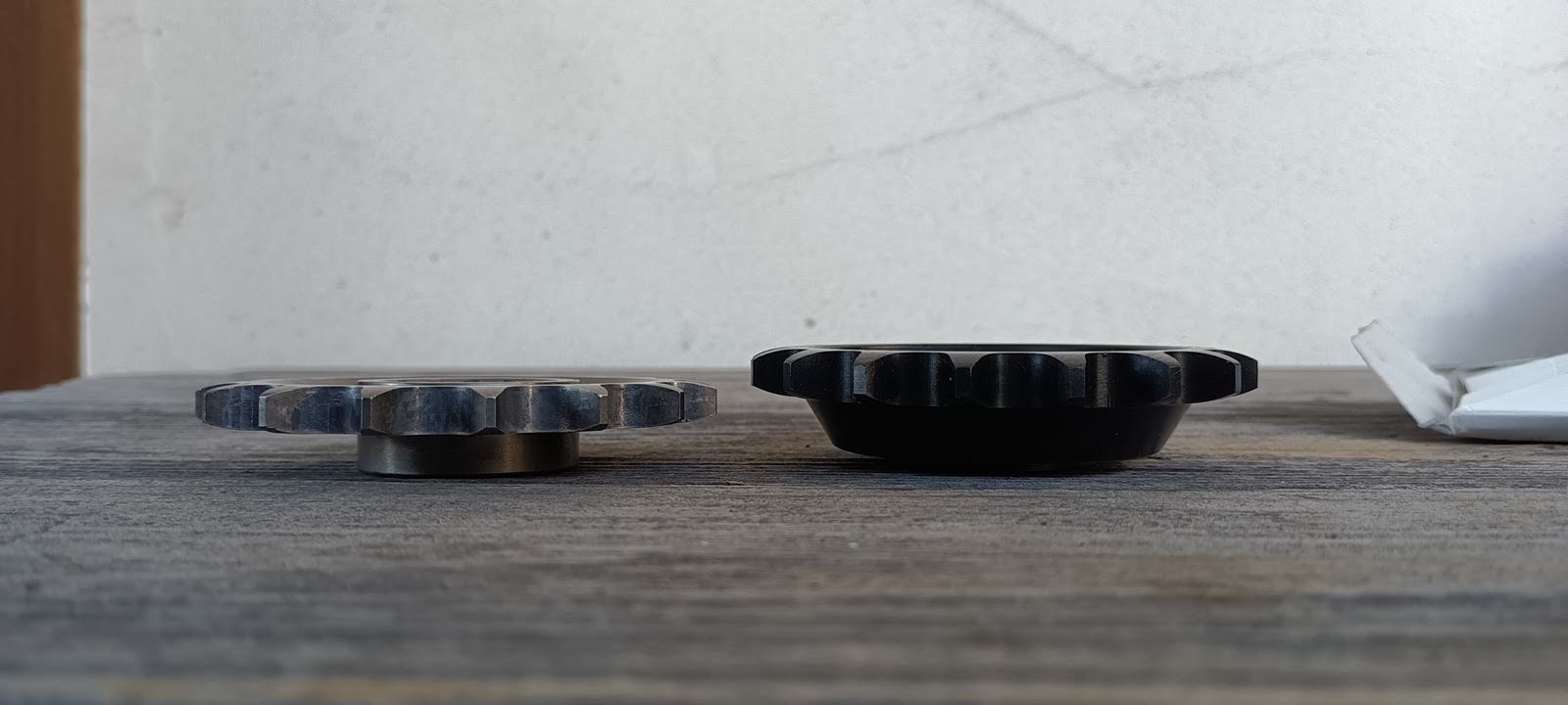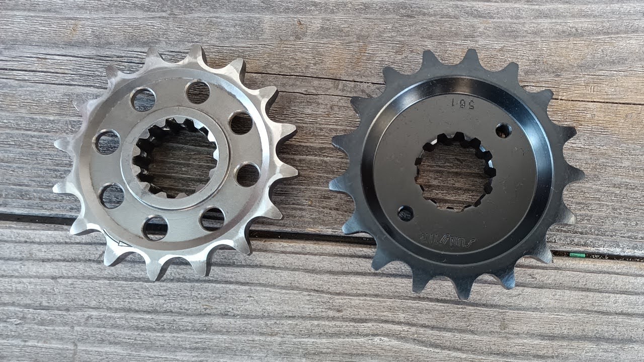 左がRC24から外したAFAM製のRC30スプロケット、右がSUNSTARのCB750F用10mmオフセットスプロケットだ。AFAMもSUNSTARも一流メーカーだけあって、美観も含めてとても良くできている。取り付けたら見えないのにね。
