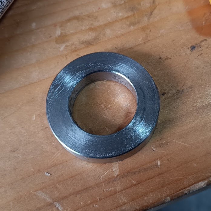 M20のワッシャーはだいたいが3mm厚なので、2枚重ねればOKだったのだけれど、なんかカッコ悪いので作ってもらったが、これは見栄え(ほとんど見えないが)としては大成功だった。カッコいいわ。
