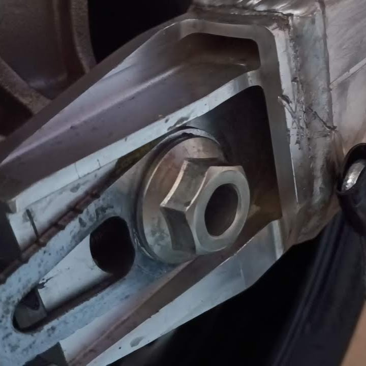 アクスルシャフトはまだ微妙に長かった。なので、M20厚さ3mmのワッシャーをアクスルナット側に入れてあるが、ワッシャーの外径が40mmなのでちょっとナットのフランジからのはみ出しが大きい。