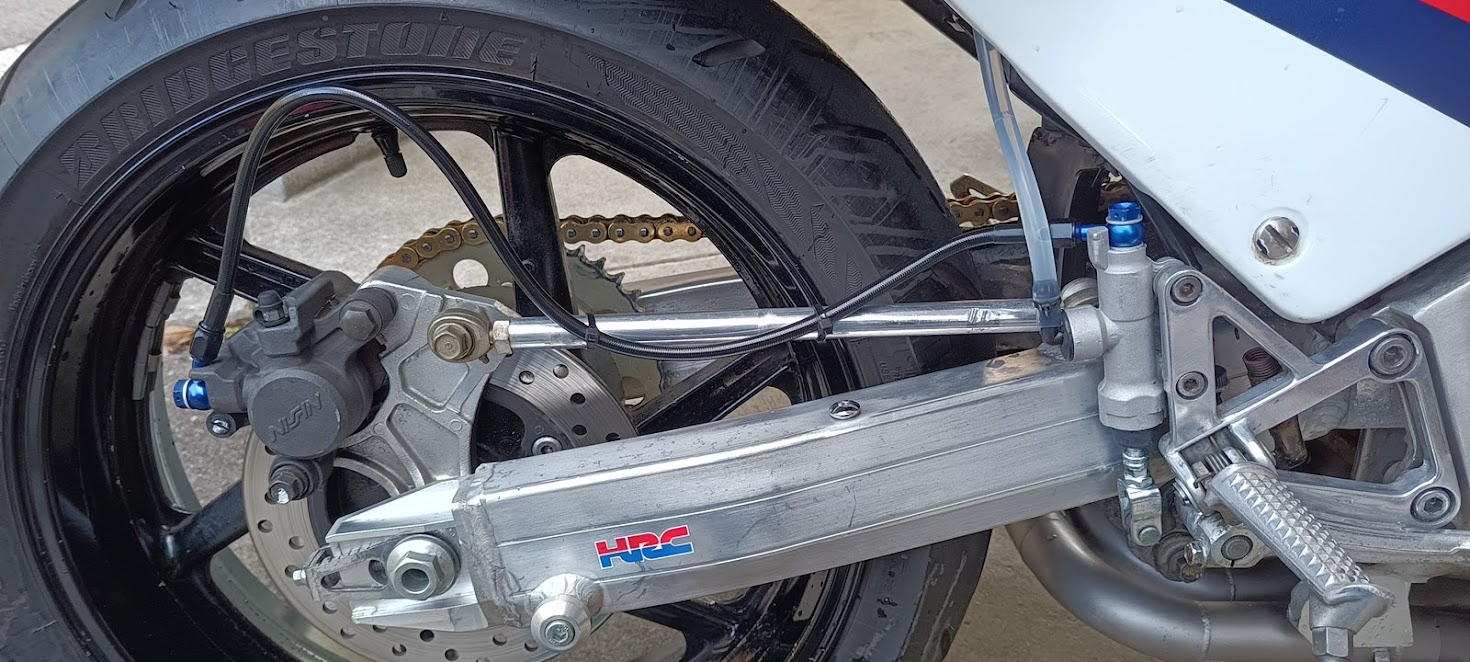 VFR400対応とのことだけれど、取り付けボルトピッチが45mmでマスター径が1/2インチなのでマスターシリンダーとしては互換がある。ホースの長さが足りなかったから近所のホームセンターで内径7mmのシリコンホースを買ってきて取り替えてやったのと、アルミ板でステーを作ってマスターカップを取り付けられるようにしてやった。