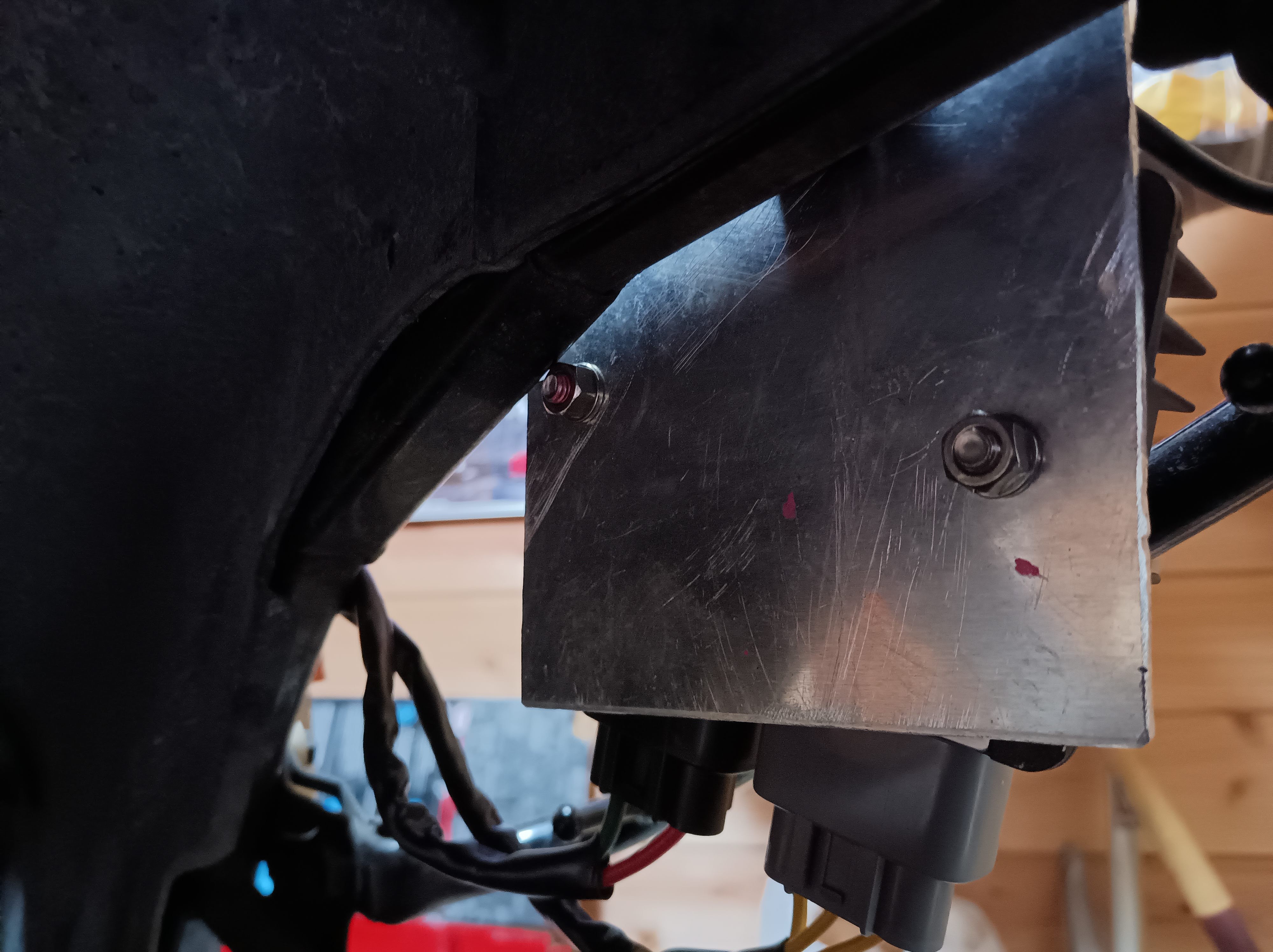 俺のRC24はMVRの左出しマフラーにしているので、左側は作業スペースがちょっと厳しそうだったので、右側に移設することにした。おあつらえ向きにM6のネジ穴があるので、そこに3mm厚のアルミ板の切れ端をステーにして取り付けた。