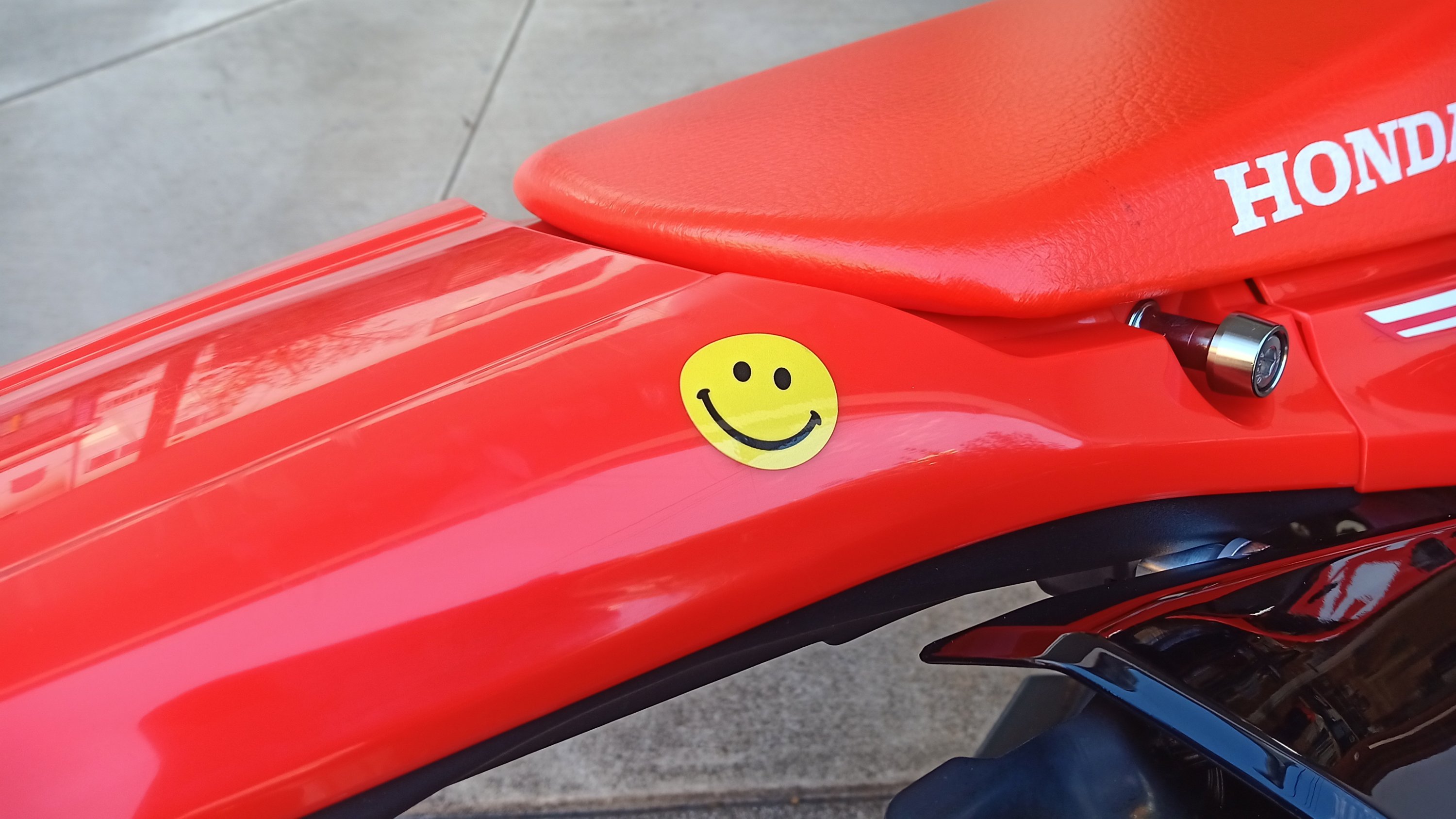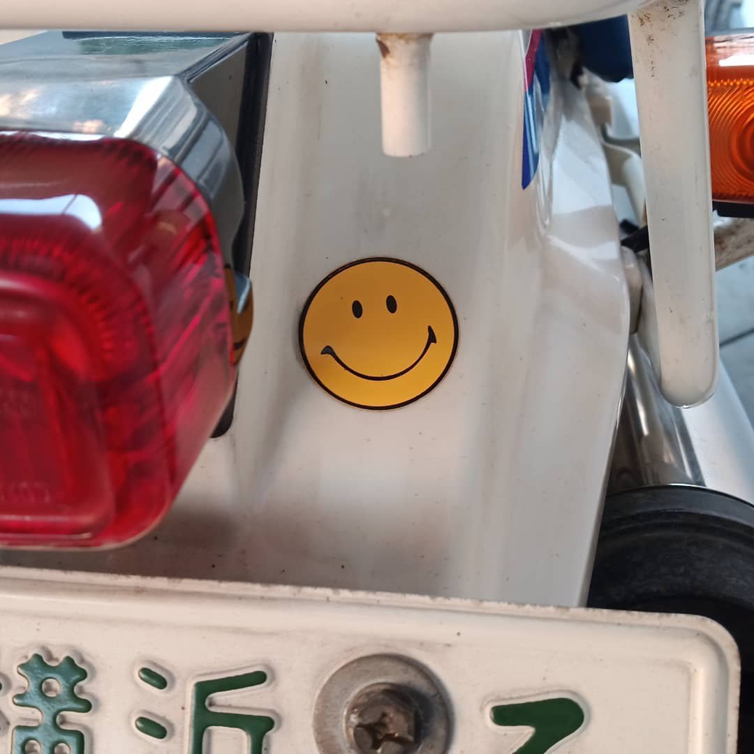 妻が乗ってたSEROWにニコちゃんマークが貼ってある。妻が自分で貼ったのではなくて、バイク仲間が勝手に貼ったとか言ってた気がするが、出会った頃には既に貼ってあった。