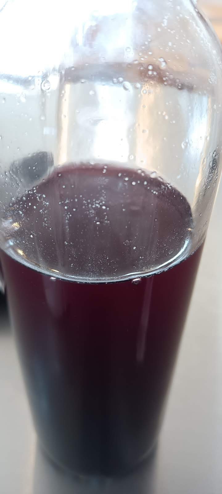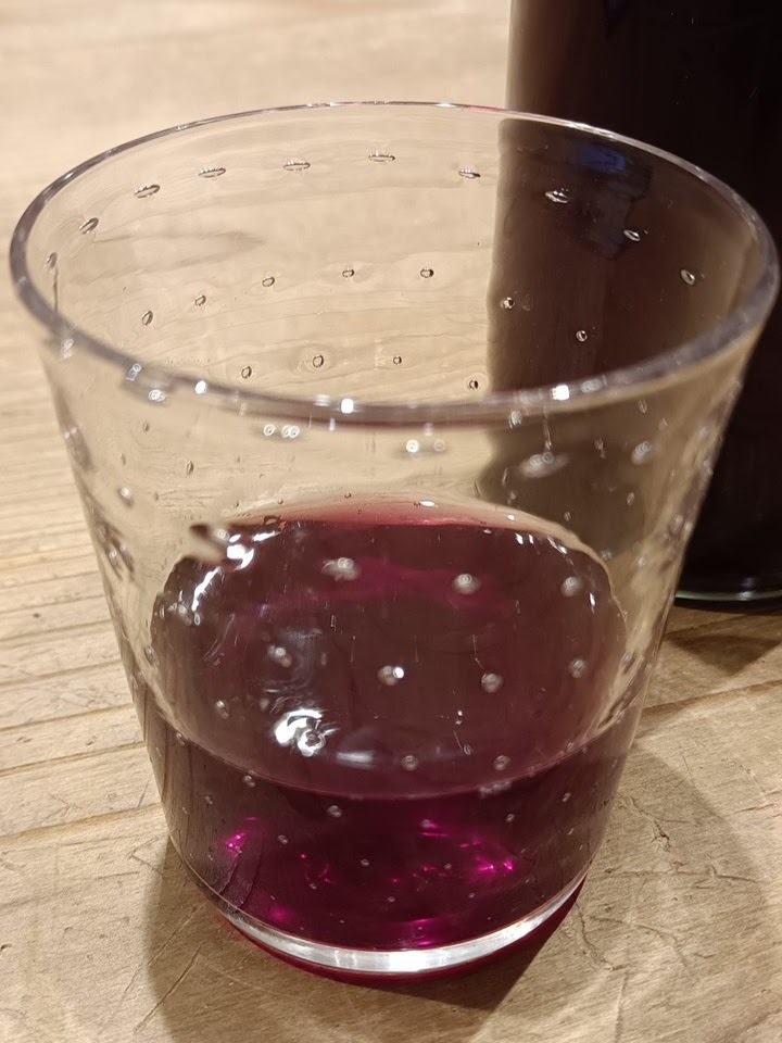 夏に作ったブラックベリーワインもどき。ほとんどアルコールは感じない程度で止めてある(違法になるのでね)が、冷蔵庫のは鮮やかな赤。常温保存のはワインみたいな濃い赤になってきた。