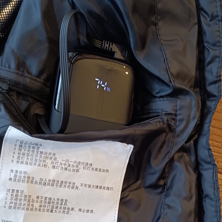 バッテリーポケットは左の内側でUSBケーブルがポケットの中から生えているので、そこに5V/2A以上のモバイルバッテリーを繋げて使用する。バッテリーは付属していないが、手持ちのフツーのモバイルバッテリーが利用できる。
