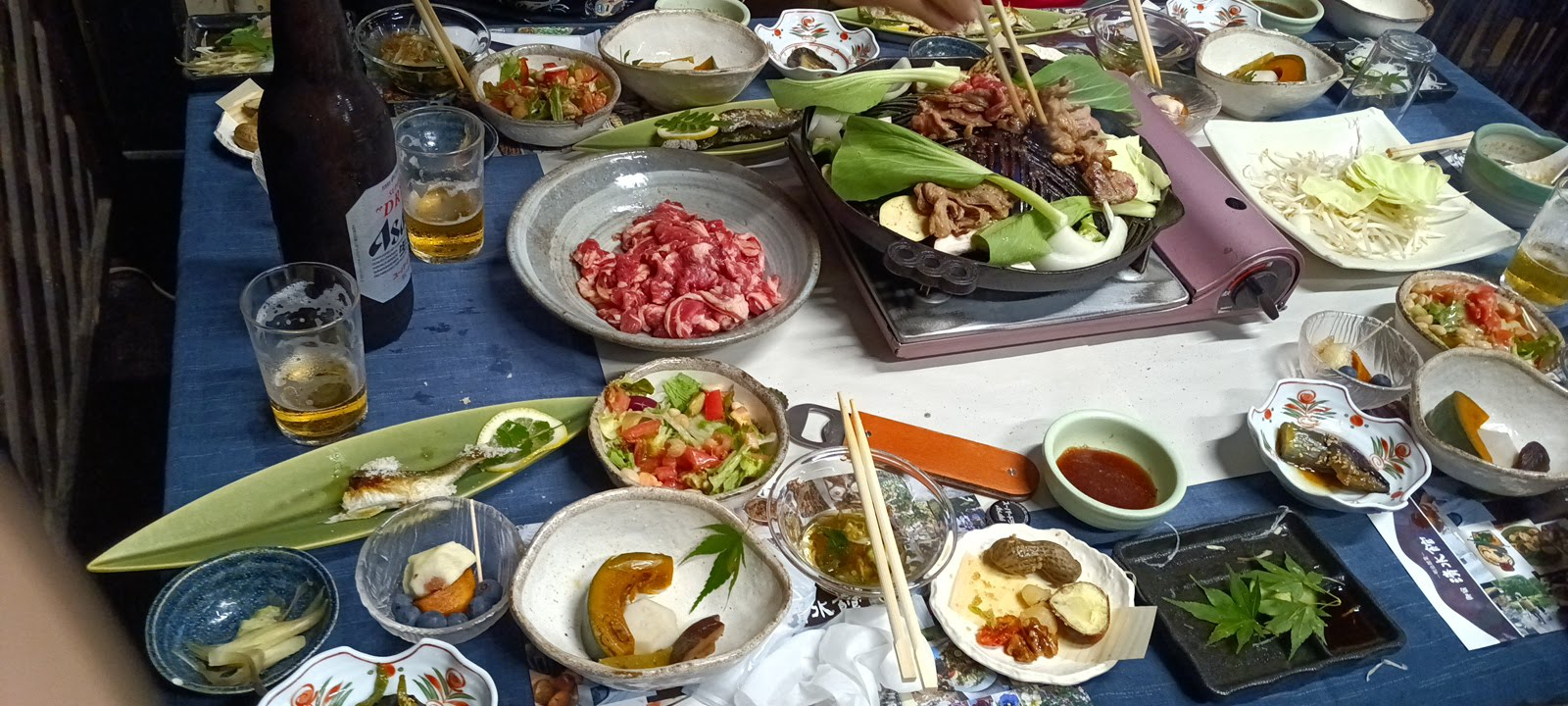 夕食の写真を貼っておくけれど、馬刺し、アマゴ、猪肉、蕎麦、揚げ物などかなりガッツリだったが美味しかった!