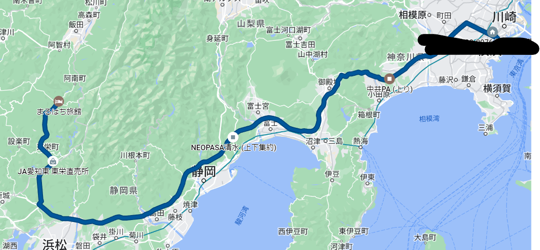 新東名で浜松から北上したほうが近いし、他のメンバーさんは浜松でウナギを食べるっていうプレイベントに参加しているけれど、俺は中央道で行きたかったのでこのルートにした。350Kmくらいだったと思う。