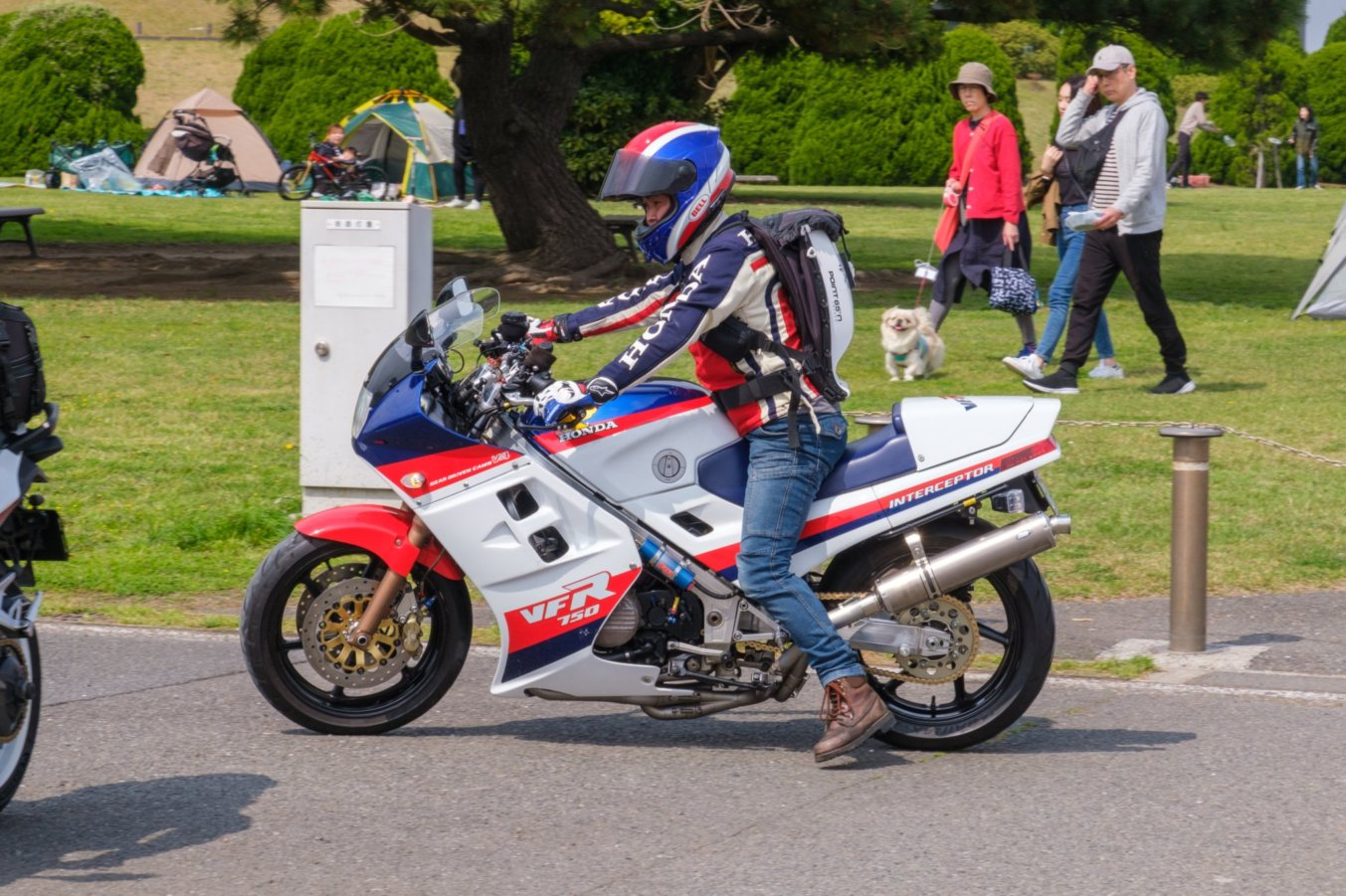 手前から4番目に置いてあるトリコロールのRC24が俺のVFR、5番目が俺と一緒にVFR Owners Clubを立ち上げた方のVFRだ。