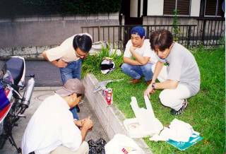 以降はとらぞうさんにすべてやっていただいて、キャブを分解してみると、中身がガビガビでした(^^; 特に左後ろのキャブの中身は錆びまくりでした。 キャブを掃除してくれているのが「とらぞう」さん、左から中村さん、大友組長、浅みパパです。 んで、キャブクリーナが必要って事になったのですが、手持ちは有りません。そこで車でこっちへ向かってくれている中村さんに電話して「途中で買って来てちょんまげ」攻撃(^^; 中村さんが買って来てくれたキャブクリーナでキャブを掃除して、とりあえずそのままクリーナー液に浸した状態で本日終了です。 この辺りで小平さんから電話で「RC46いいッスよぉ〜!!」との強烈な攻撃!! と言う訳で、今回も始動までは至らなかったんですけど、キャブのインナーパーツを交換して、プラグも新品にしてやれば、なんとか始動できそうです。