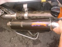 01/09/02 MVR+TBR 今日、MVRのエキパイに小島さんからお借りしたTwoBrothersのカーボンサイレンサーを取り付けました。 まず、先週前田メカと二人掛りで外せなかったMVRのサイレンサーを預けてあった近所のウィング店に取りに行きました。したらまだ作業していなかったのですが、それは私に「焼いて良いか?」を確認するためでした。 んで、家に持って帰ってTwoBrothersのサイレンサーを取り付けました。 そしてエンジン始動!! 実際に走ってみると、バックファイヤの音もMVR程は気にならないし、見た目もカッチョ良いので、ナカナカGoodです(^.^) |