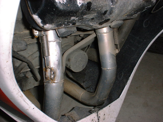 このジョイントを止めているスプリングのフックが取れちゃったんですけれど、実は後ろのエキパイのフックも00年の5月に脱落して修理してもらっているんです(^_^;)