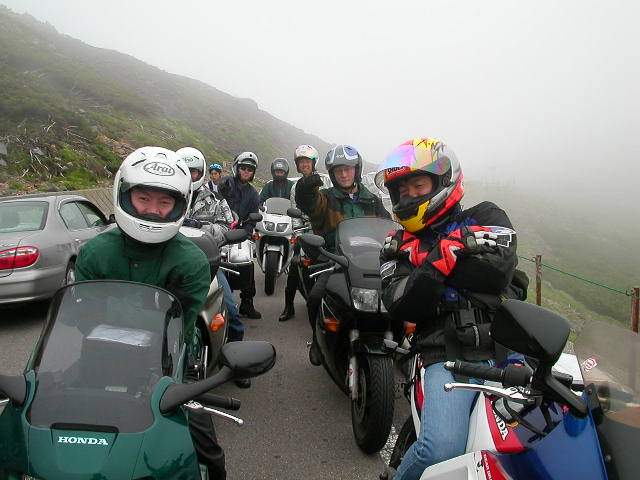乗鞍のてっぺんの畳平は標高2700mもあるので、エンジンのフケ上がりがカナリ苦しい感じでしたが、なんとか乗り越えました。写真は畳平駐車場の直前です。向かって左はメンバーの徳ちゃんで、右が私。奥に写っている皆さんもクラブのメンバーさんです。霧が出ていて寒かったですよ〜。