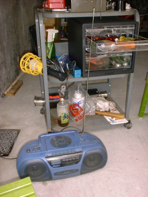 写真は、クラッチカバーを外した状態のRC24と、ガレージに数週間前に新たに仲間入りしたCDが壊れたCDラジカセです。作業中にFM