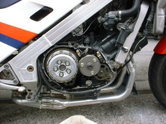 レーシングスタンドでリアを浮かしておいて、オイルキャップからクラッチを覗きながらギアを入れた状態でリアタイアを手で回してみると、クラッチが回っていませんでした。