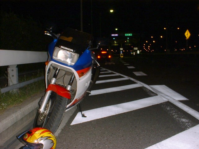路肩に寄せて辺りを見回すと、「湾岸環八」の入り口の導入路上であることに気が付いたので、そのままバイクを押して「逆走」し、料金所も逆流してなんとか首都高の外に出しました。写真は入り口から人力で出てきたインチキセプターです。